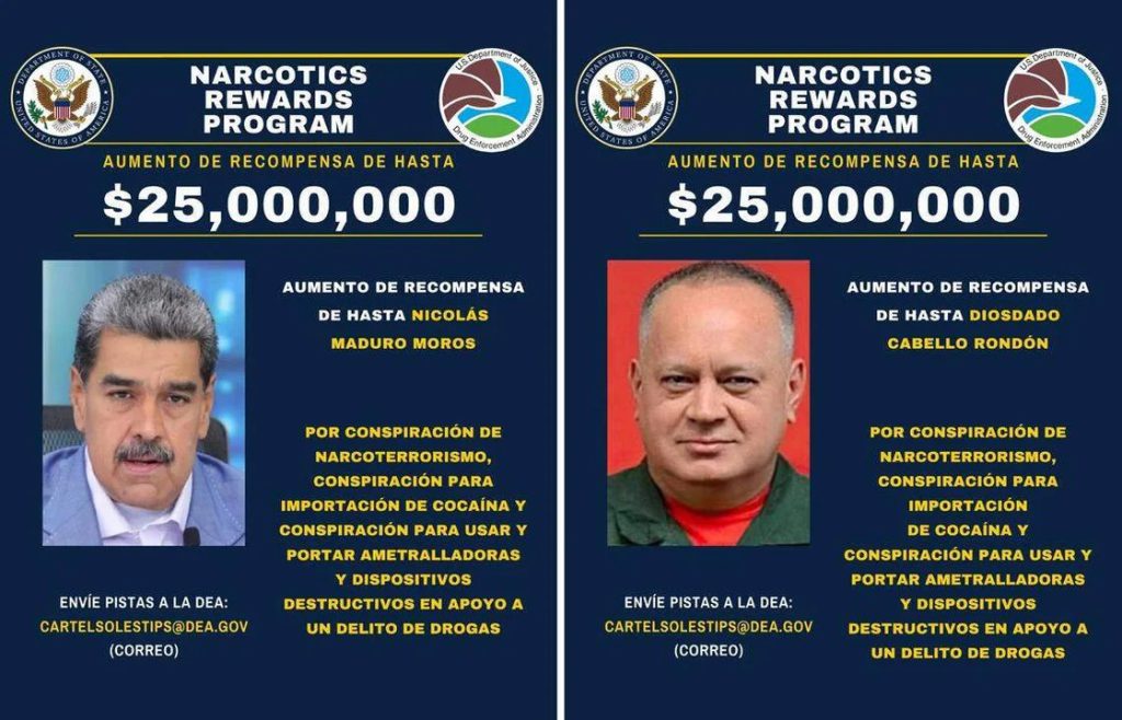 Asimismo, actualmente ofrece 25 millones de dólares por la captura de algunos de sus principales colaboradores, entre ellos el ministro del Interior, Diosdado Cabello, presunto responsable de las operaciones del cartel.