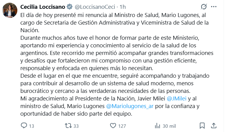 “El día de hoy presenté mi renuncia al Ministro de Salud, Mario Lugones, al cargo de Secretaria de Gestión Administrativa y Viceministra de Salud de la Nación”, escribió la funcionaria en su cuenta de X.