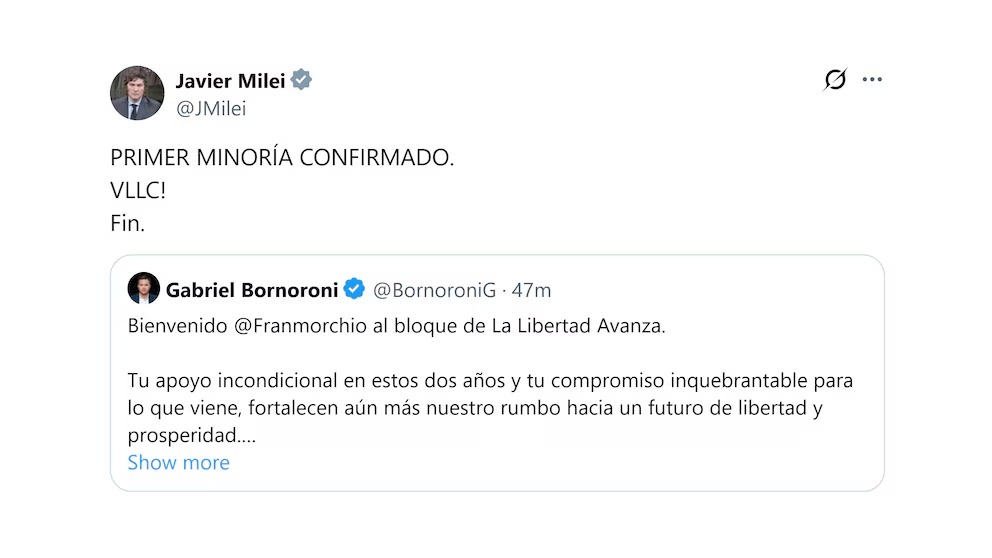 “Con tu aporte valioso, estaríamos alcanzando la primera minoría, lo que nos permitirá seguir impulsando con fuerza las ideas de la libertad, dejando atrás el populismo kirchnerista que tanto daño le ha hecho a nuestro país”, escribió Bornoroni. “Primera minoría, confirmado”, celebró Milei.