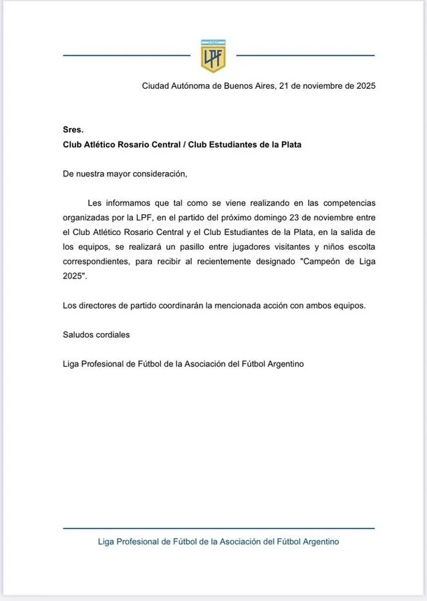 Así lo dispuso el organismo y lo oficializó a través de un comunicado dado a conocer esta noche: “Tal como se viene realizando en las competiciones organizadas por la LPF, en la salida de los equipos se realizará un pasillo entre jugadores visitantes y niños escoltas, para recibir al recientemente designado Campeón de la Liga 2025”.