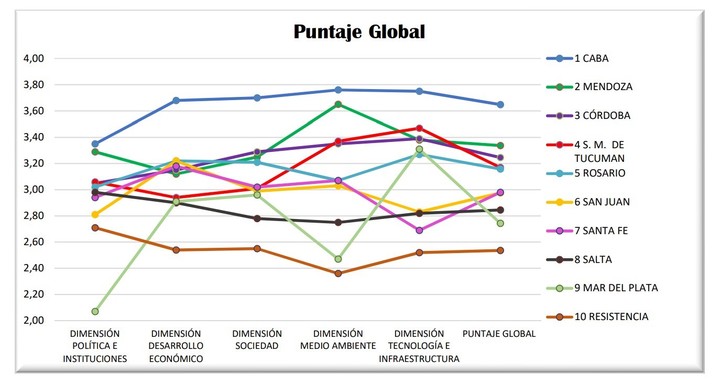 Las diez ciudades lograron una suba de 0,06 puntos en general. Buenos Aires sostiene la mayor valuación general y en cada una de las dimensiones de análisis que ya había obtenido en 2024. Los números globales de la capital argentina muestran una situación estable, con valores similares a los alcanzados en la medición del año pasado. Mendoza, Córdoba y Rosario también mantuvieron sus calificaciones, con ligeros aumentos en sus índices.