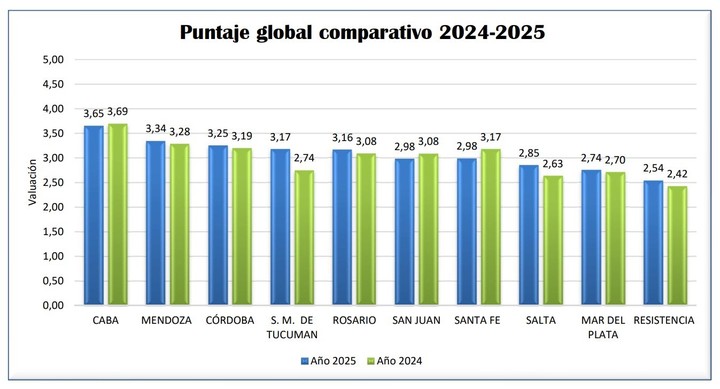 La Ciudad Autónoma de Buenos Aires lidera con 3,65, seguida por Mendoza, con 3,34; Córdoba, 3,25; San Miguel de Tucumán, 3,17; Rosario, 3,16; San Juan y Santa Fe, ambas con 2,98; Salta, 2,85; Mar del Plata 2,74 y cierra Resistencia con 2,54.