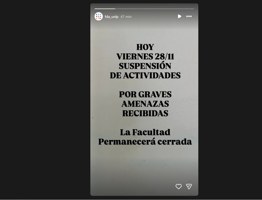 Una amenaza de “masacre” al estilo norteamericano sorprendió a las autoridades de la Facultad de Artes en la Universidad de La Plata, y decidieron suspender las clases.
