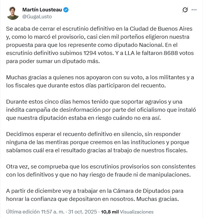 «Como marcó el escrutinio provisorio, casi cien mil porteños eligieron nuestra propuesta para que los represente como diputado nacional. En el escrutinio definitivo subimos 1.294 votos y a LLA le faltaron 8.688 votos para poder sumar un diputado más», destacó Lousteau.
